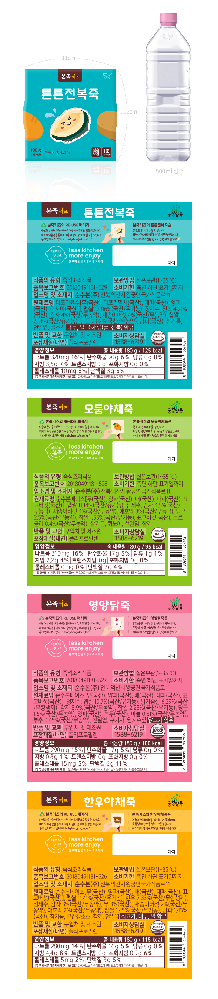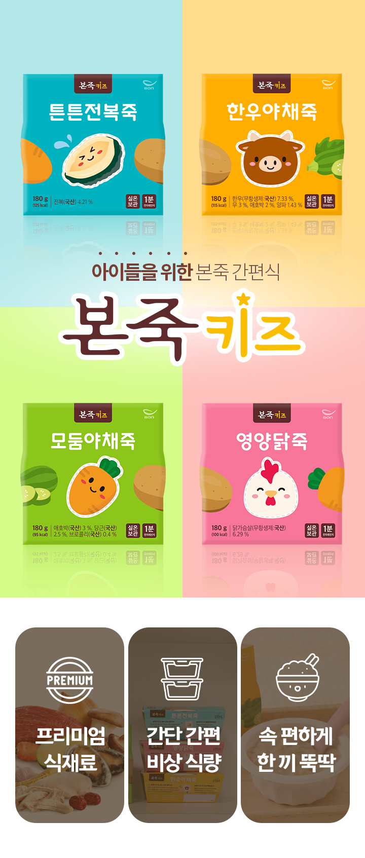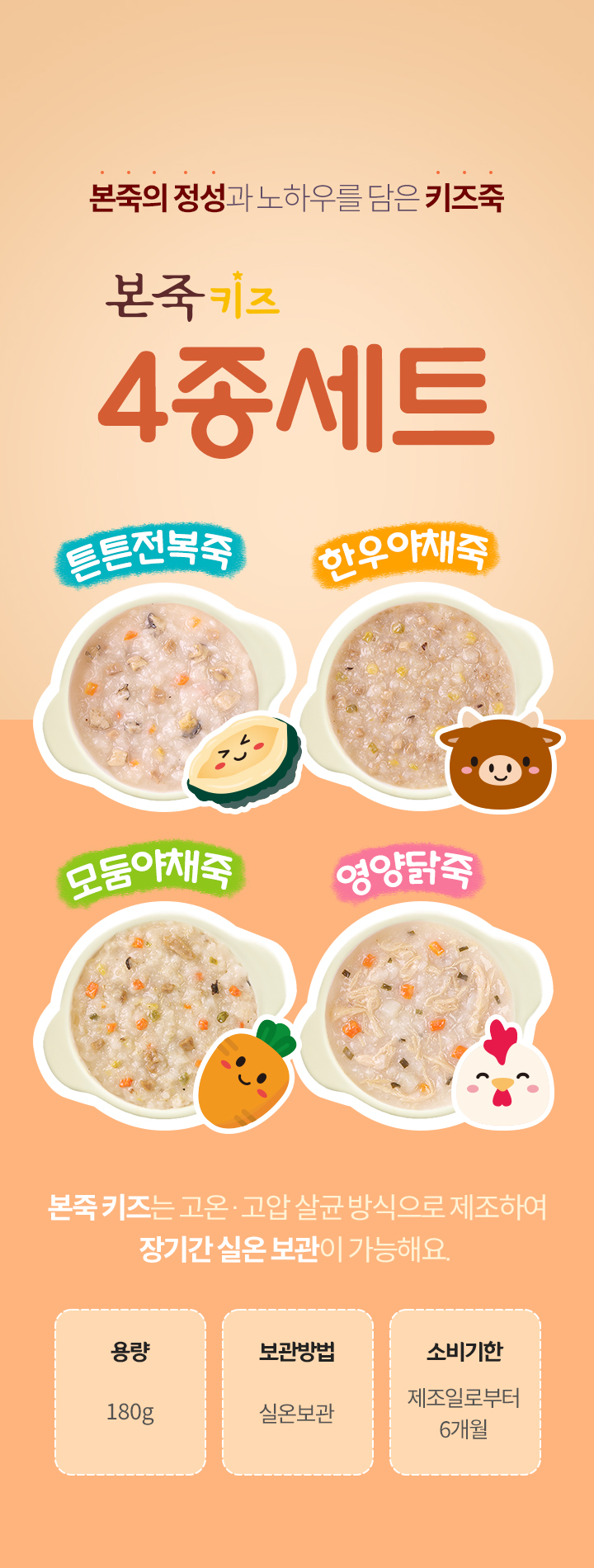 권장 연령: 3세 이상 / 모둠야채죽[180g], 영양닭죽[180g], 튼튼전복죽[180g], 한우야채죽 [180g]